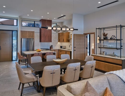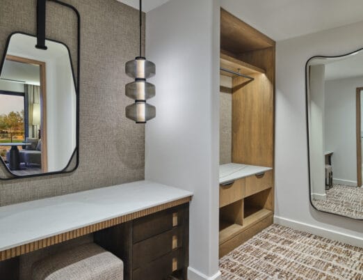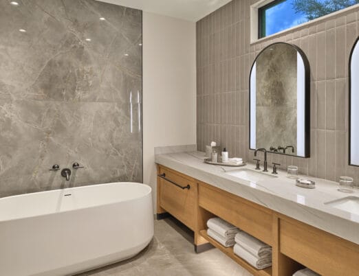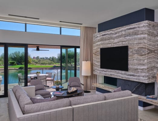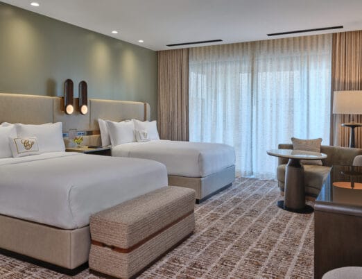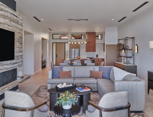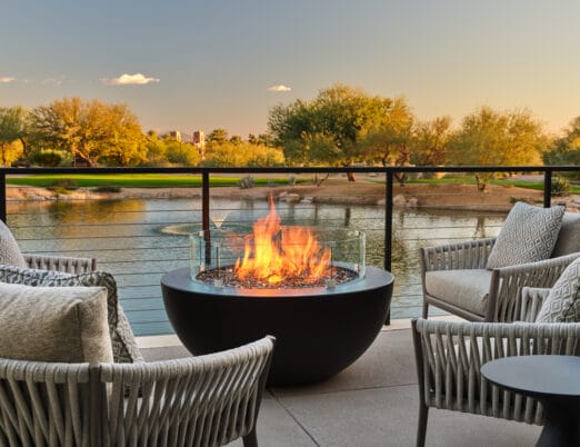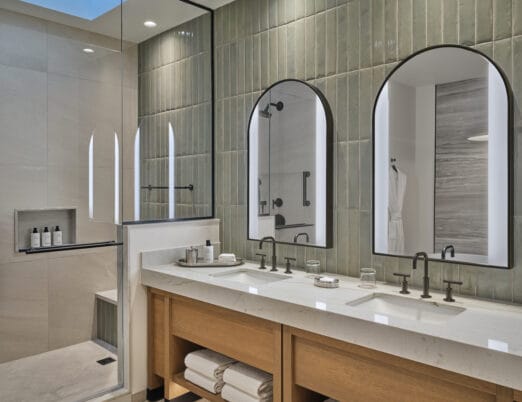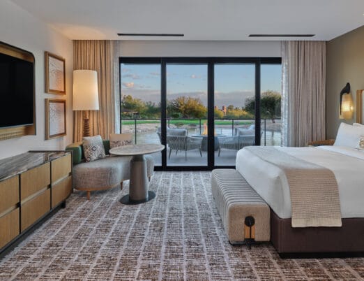 The 3,450 sq ft 4-bedroom / 4 bath, single-level Villas offer the pinnacle of desert luxury, with soaring ceilings and expansive windows framing sweeping resort and mountain views. An oversized terrace with plush seating, fire table, private hot tub, and seamless indoor-outdoor living captures the essence of Sonoran sunsets. The open layout includes refined tile flooring, a chef’s kitchen with stone island, dining for eight, and a spacious living room with a sectional sleeper, sleek TV, and dramatic fireplace. The primary king retreat features spa-style en-suite with, dual vanities, glass shower, freestanding soaking tub, and private water closet. A second king guestroom also enjoys a private en-suite and patio. Two double-queen guestrooms provide versatility: one with its own en-suite and patio access, the other with a stylish bath nearby. Designed for both gathering and privacy, with spaces to connect and moments to escape.