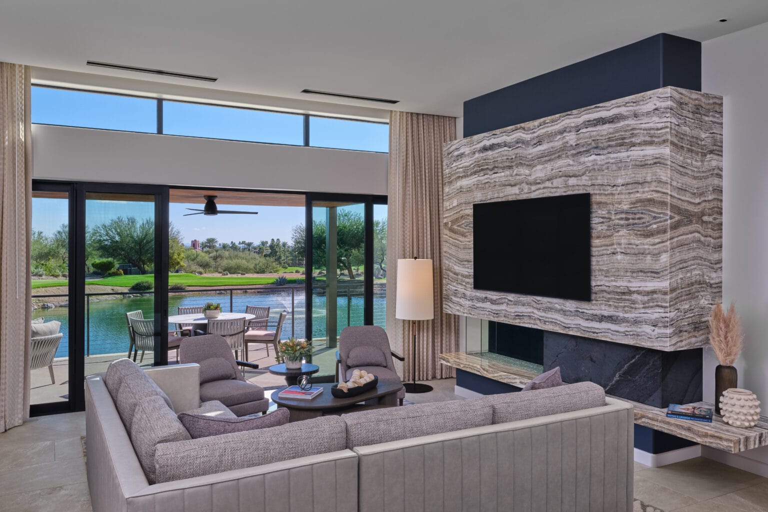 - Dramatic gas fireplace wall