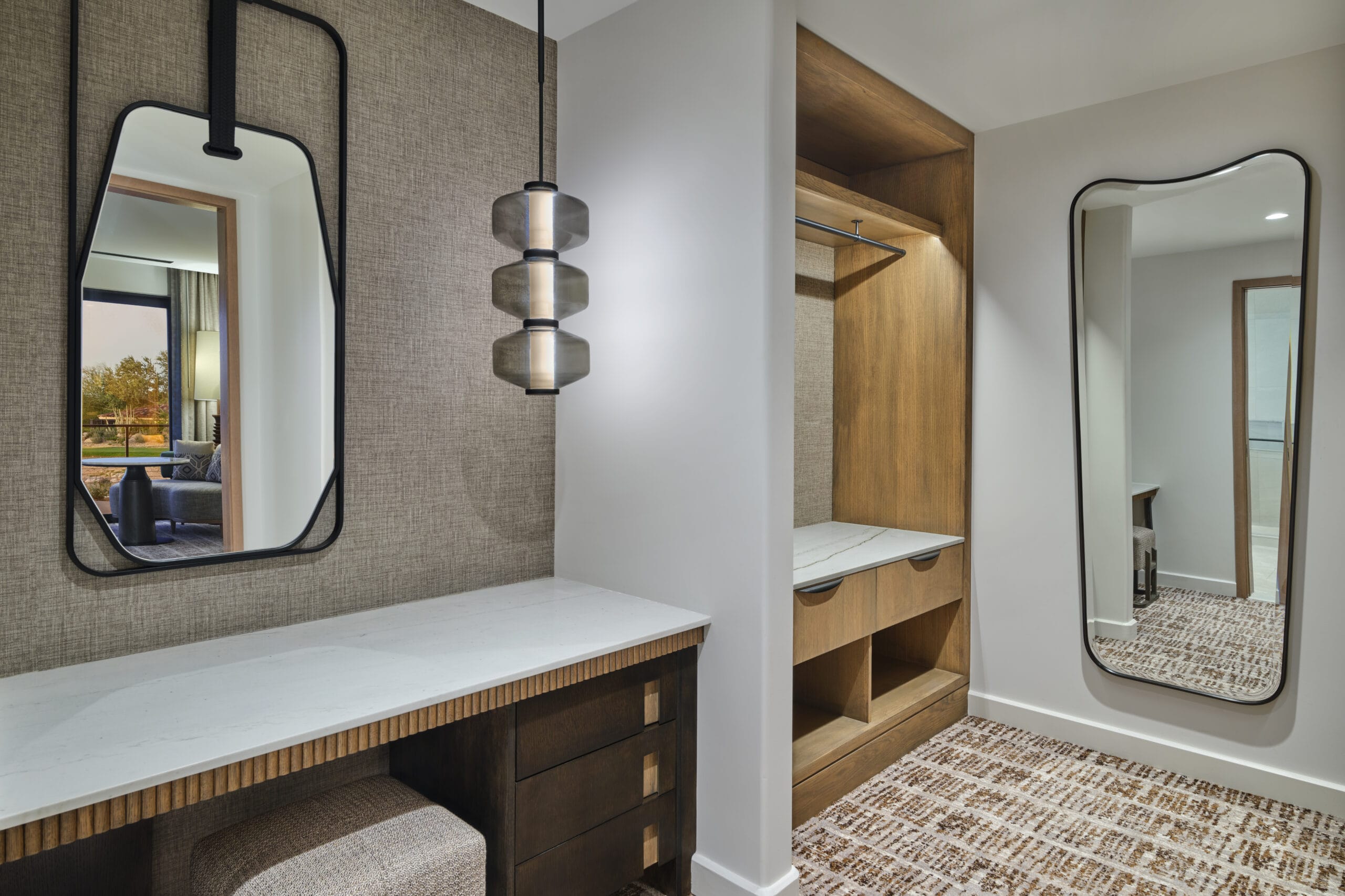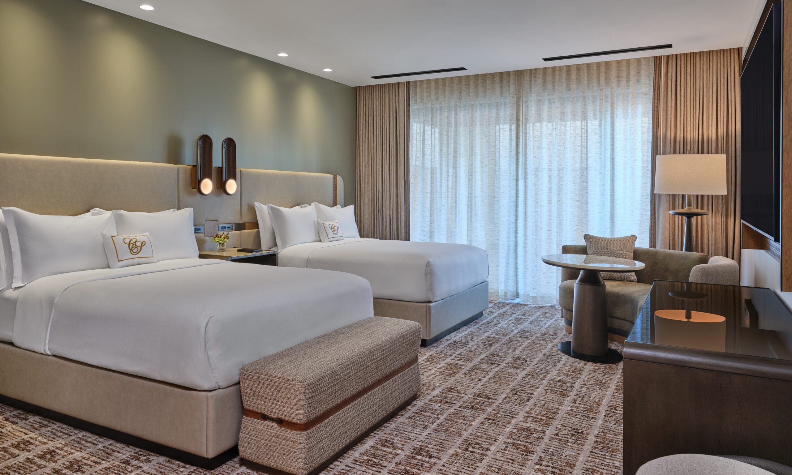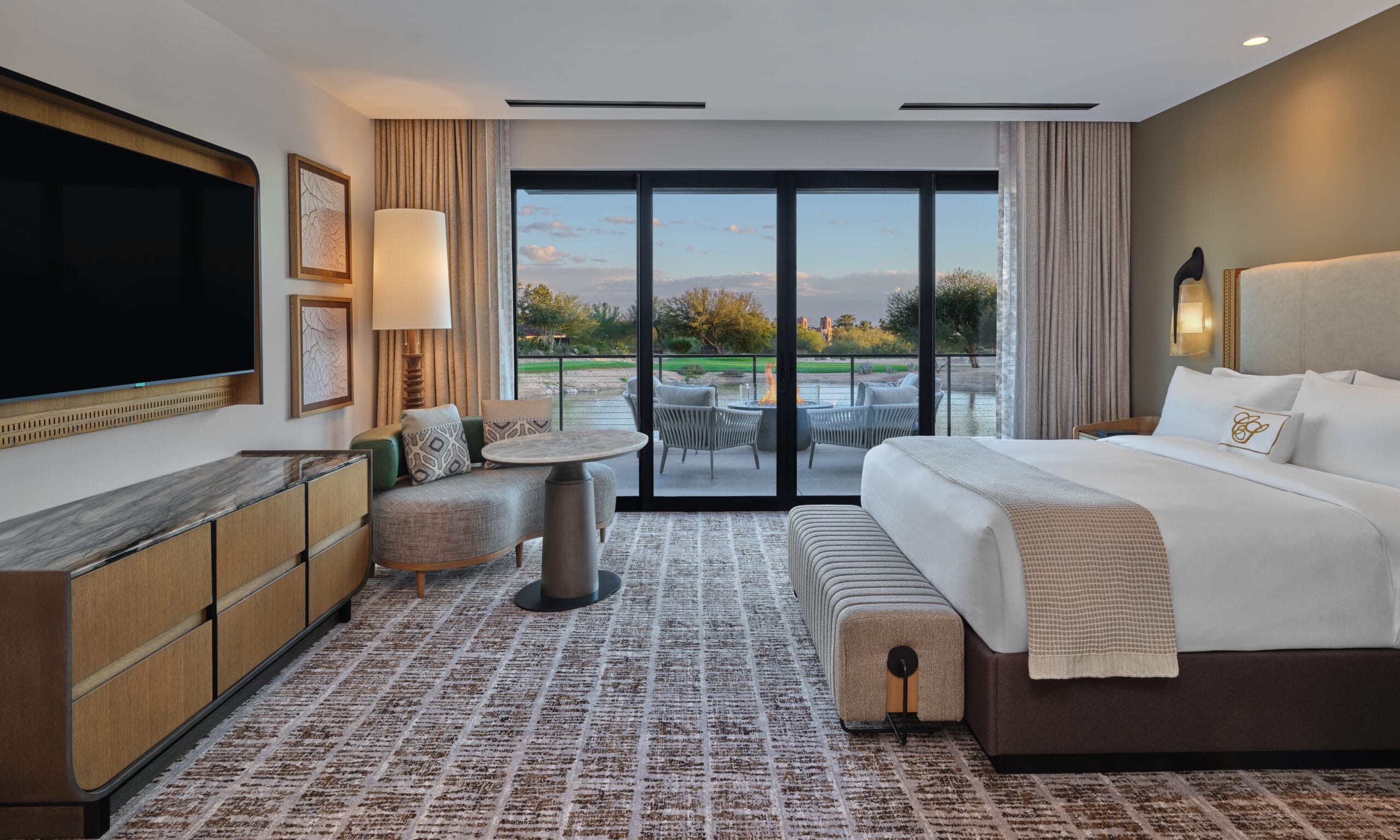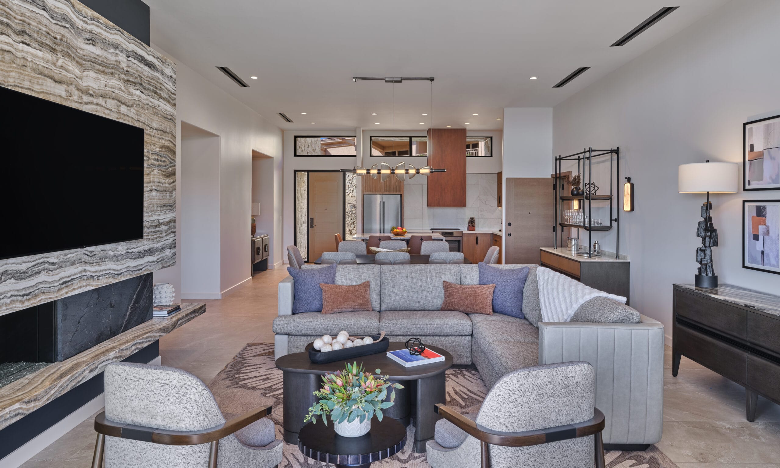 The 3,450 sq ft 4-bedroom / 4 bath, single-level Villas offer the pinnacle of desert luxury, with soaring ceilings and expansive windows framing sweeping resort and mountain views. An oversized terrace with plush seating, fire table, private hot tub, and seamless indoor-outdoor living captures the essence of Sonoran sunsets. The open layout includes refined tile flooring, a chef’s kitchen with stone island, dining for eight, and a spacious living room with a sectional sleeper, sleek TV, and dramatic fireplace. The primary king retreat features spa-style en-suite with, dual vanities, glass shower, freestanding soaking tub, and private water closet. A second king guestroom also enjoys a private en-suite and patio. Two double-queen guestrooms provide versatility: one with its own en-suite and patio access, the other with a stylish bath nearby. Designed for both gathering and privacy, with spaces to connect and moments to escape.